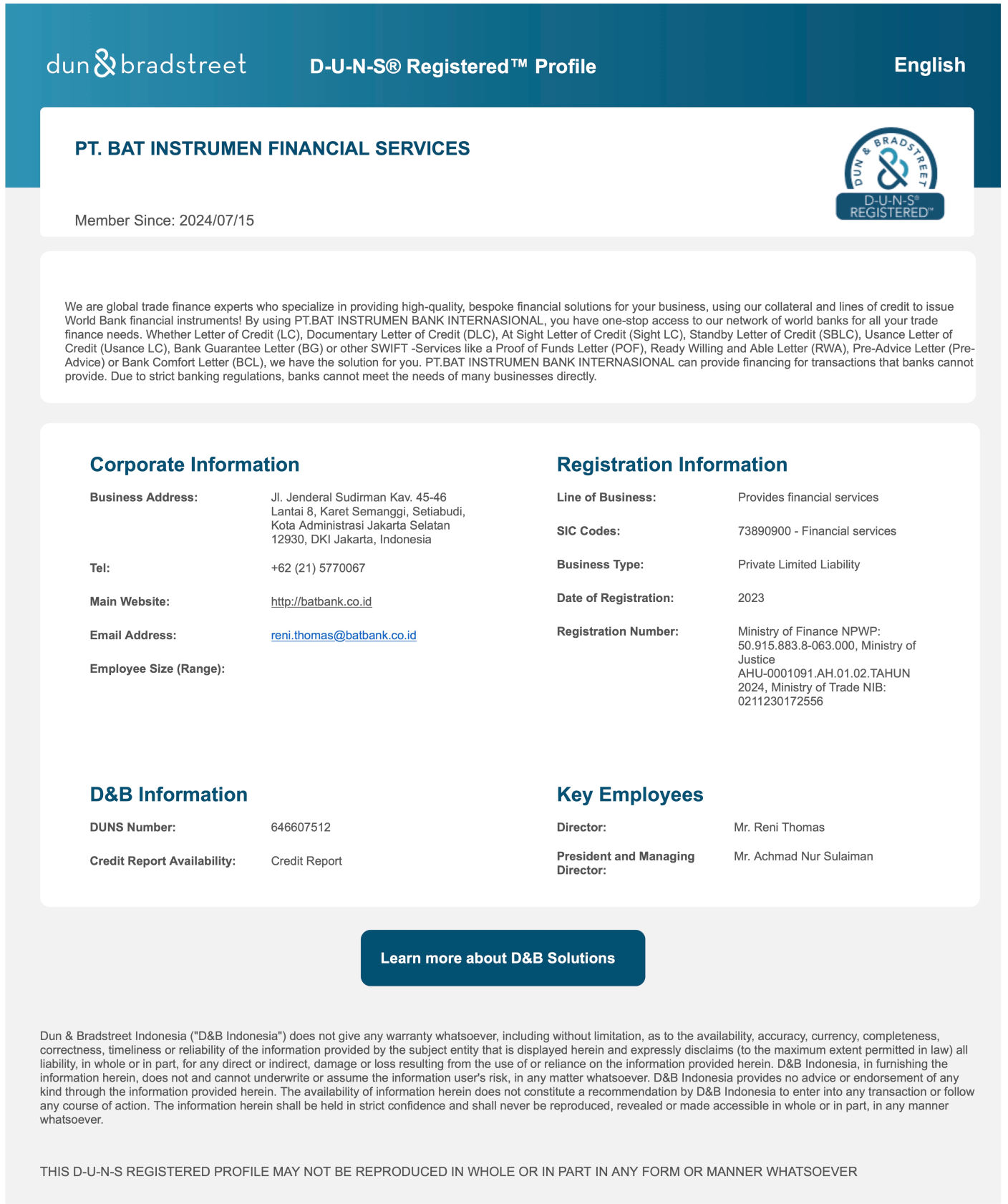 We at Bat Bank are proud to be registered with Dun & Bradstreet, leveraging the world's most comprehensive business data and insights to identify new opportunities, navigate evolving risks, and have proven to be a trusted, instrumental Bank for your financial goals.